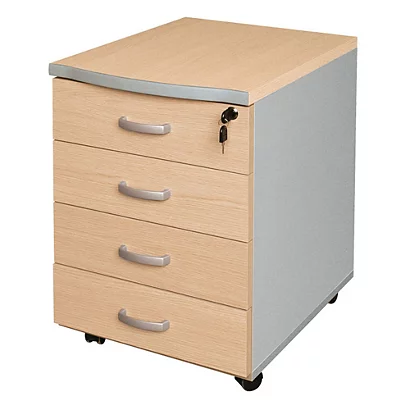 - Estremamente versatile e resistente, questa cassettiera ha 4 capienti cassetti ed è fornita di ruote pivotanti che ne agevolano lo spostamento e la rendono molto versatile. Dotata di un piano in melanimico spesso 25 mm ha una finitura in legno di colore acero con profili e maniglie per i cassetti in PVC di colore grigio alluminio. Per le sue misure e caratteristiche, può essere associata alle scrivanie della stessa linea, ma si adatta anche ai diversi ambienti dell’ufficio. Una serratura centralizzata a chiave garantisce sicurezza e riservatezza quando necessario.