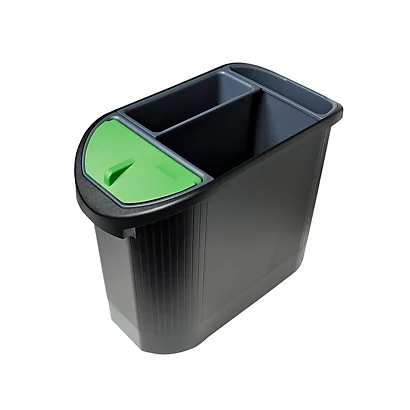 - Realizzato al 100% in plastica post-consumer e certificato Blue Angel, il cestino Topline ha una pratica forma ovale che riduce l’ingombro sotto la scrivania. L’impugnatura integrata nel bordo favorisce il trasporto e lo svuotamento, la clip di fissaggio inclusa mantiene il sacchetto della spazzatura all’interno del cestino. Inclusi 3 contenitori per la raccolta differenziata; uno dei contenitori è dotato di coperchio per isolare i rifiuti organici che emanano odori in modo ermetico.