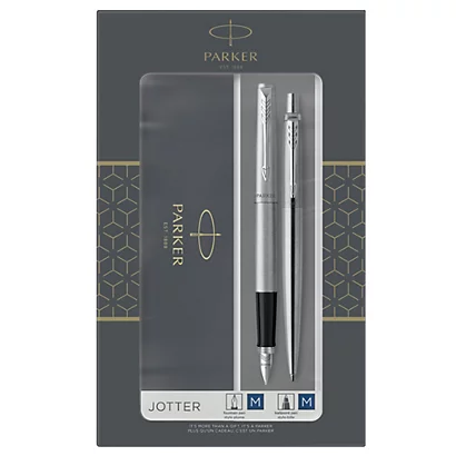 Elegante gift set che comprende la classica penna parker e una stilografica parker con fusto in acciaio inossidabile e dotato di chiusura a punta di freccia lucida sempre in acciaio inossidabile. La penna è fornita di refill quink flow colore blu e un esclusivo astuccio regalo.