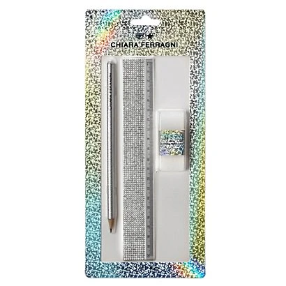 set scuola in blister composto da matita grafite hb fusto color argento ad effetto cangiante e fondo decorato con diamante, riga 20cm decorata con strass e gomma glitter dotata di fascetta in carta con logo eyelike.