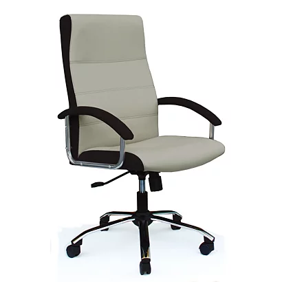 - La parte anteriore della poltrona presidenziale Krissy è realizzata in morbida similpelle grigio chiaro, mentre retro, fasce laterali ed imbottitura dei braccioli sono realizzati in tessuto con colore a contrasto nero, questo mix di colori la rendono moderna ed elegante.