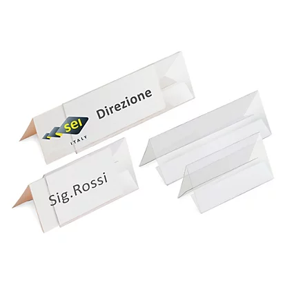 Porta nomi da tavolo in pvc rigido di alto spessore con foglio di etichette stampabili o scrivibili. Adatti a convegni, riunioni, congressi, segna prezzi, targhette identificative. Per mettere sul tavolo nomi e altre informazioni essenziali.