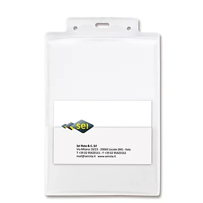 Porta nomi in pvc rigido trasparente di altissimo spessore, con rinforzo colorato. Tasca accessoria porta biglietti da visita, cards, banconote, etc. Dotati di asola centrale per la pinzetta e fori laterali per i moschettoni. Adatti a fiere, congressi, convegni, eventi sportivi, etc. Dimensioni: 10x15cm.