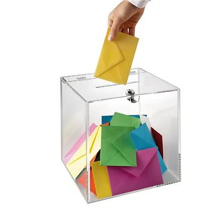 Contenitore ad urna in materiale acrilico altamente trasparente. Dotato di fessura sul lato superiore e chiusura di sicurezza con serratura e chiave. Ideale come contenitore da banco per la raccolta di suggerimenti, come espositore e complemento d’arredo per negozi e vetrine. Dimensioni: 25x25x25cm. La fessura è larga 12,5 cm.
